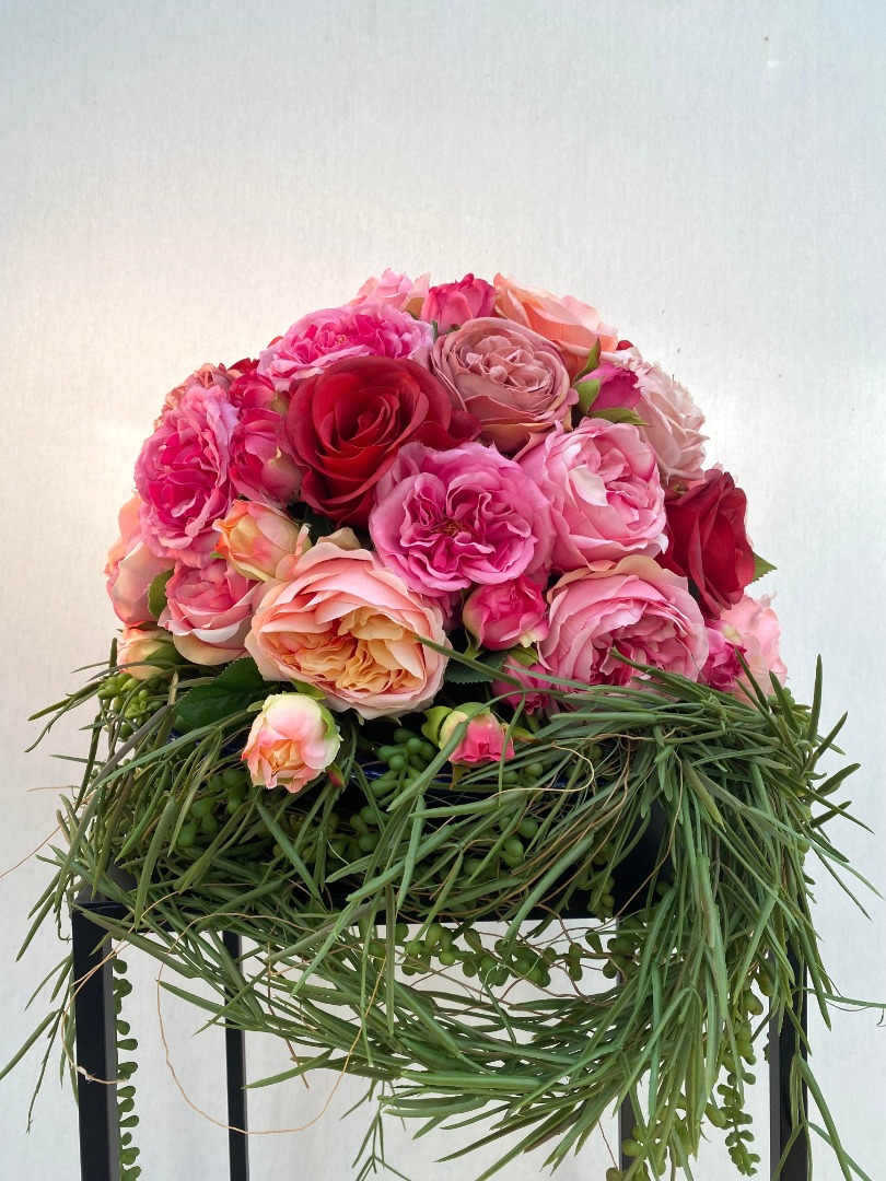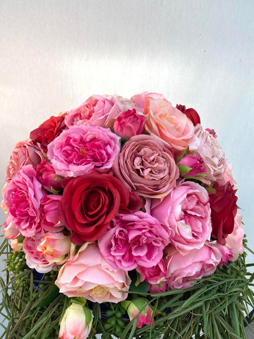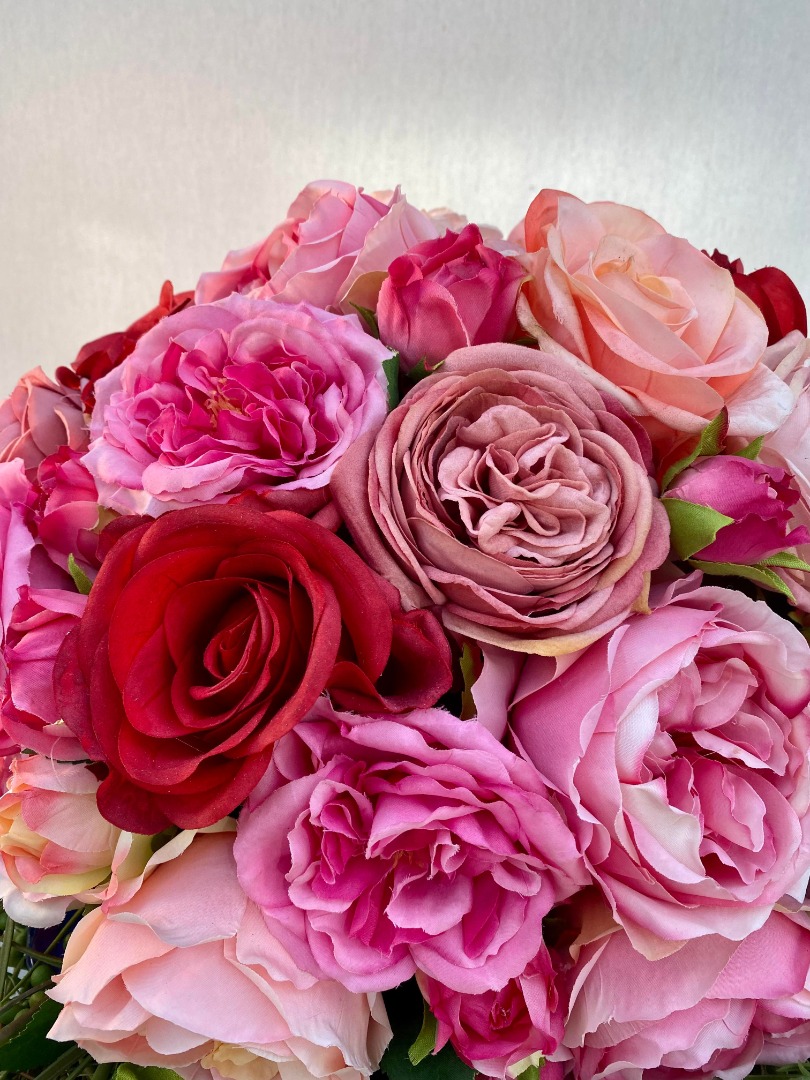Er is en kleurenpalet gebruikt van roze, rood. De Rozen zijn van de mooiste kwaliteit en niet van echt te onderscheiden. Een bloemenarrangement waar u jaren lang plezier van zult beleven.